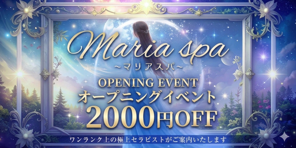 大阪堺筋本町メンズエステ【Maria Spa(マリアスパ)】只今お得なオープニングイベント開催中!ご新規様限定90分コース以上オールタイム料金2,000円OFF!!お気軽にお問合せ下さい割美適応外セラピストあり